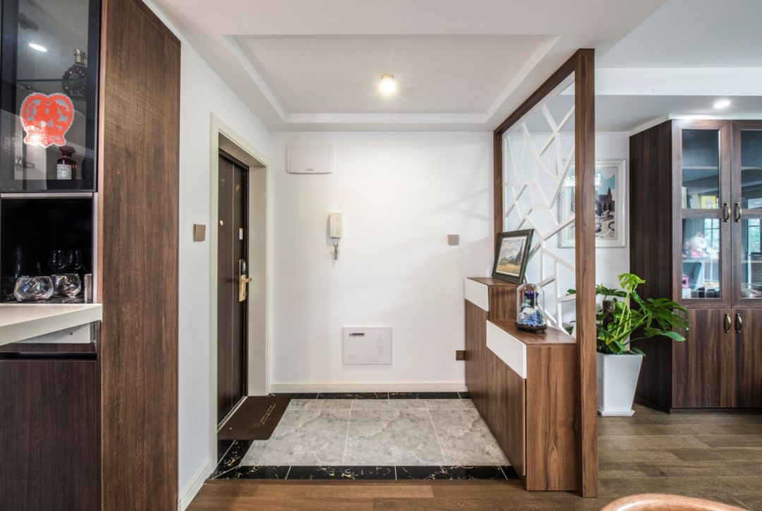 1、将原有的内开防盗门改成外开尽可能的不占用客厅面积;