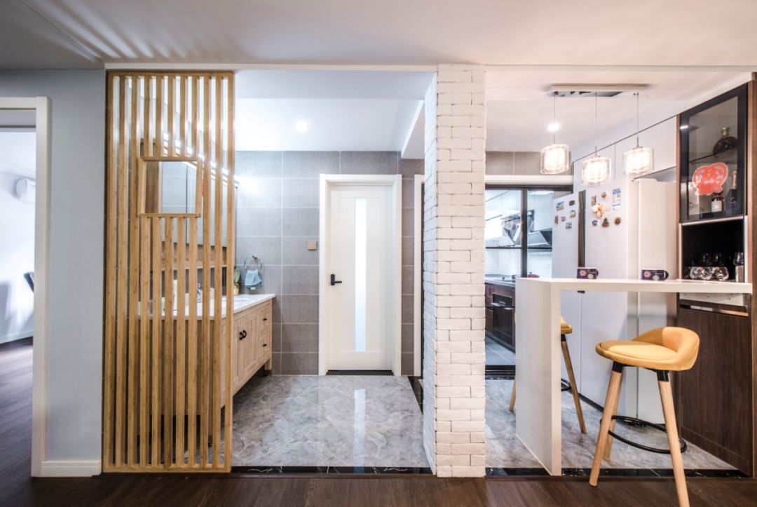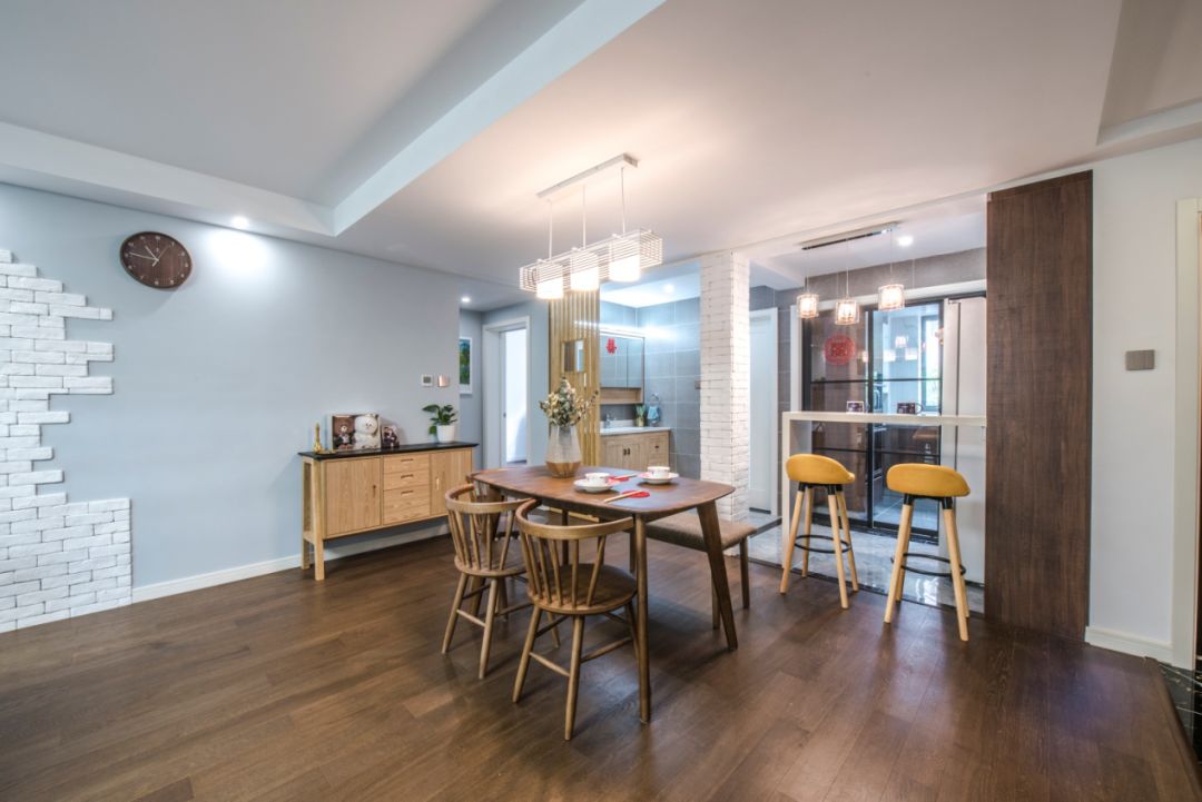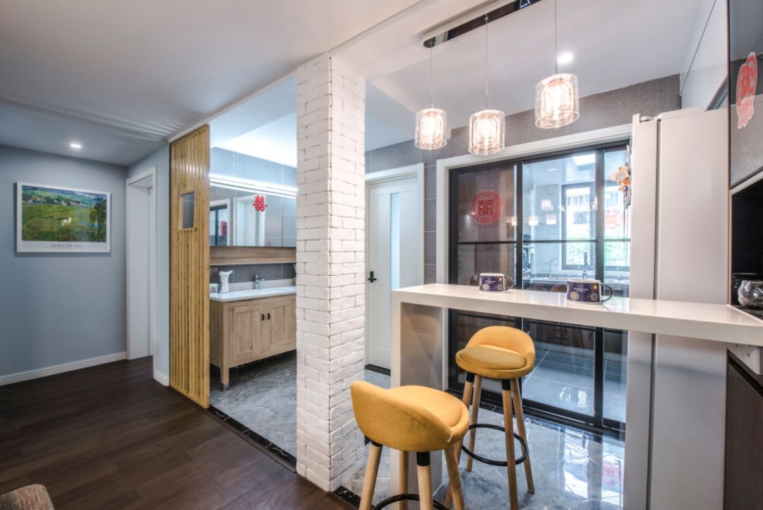 2、原本的封闭式厨房使整个餐厅看上去会比较小,南北不通透,导致采光不理想,在不影响房屋的承重结构下将原有餐厅的墙敲掉保留柱点,用吧台做隔断;