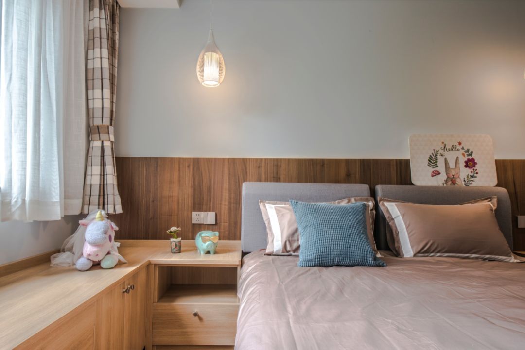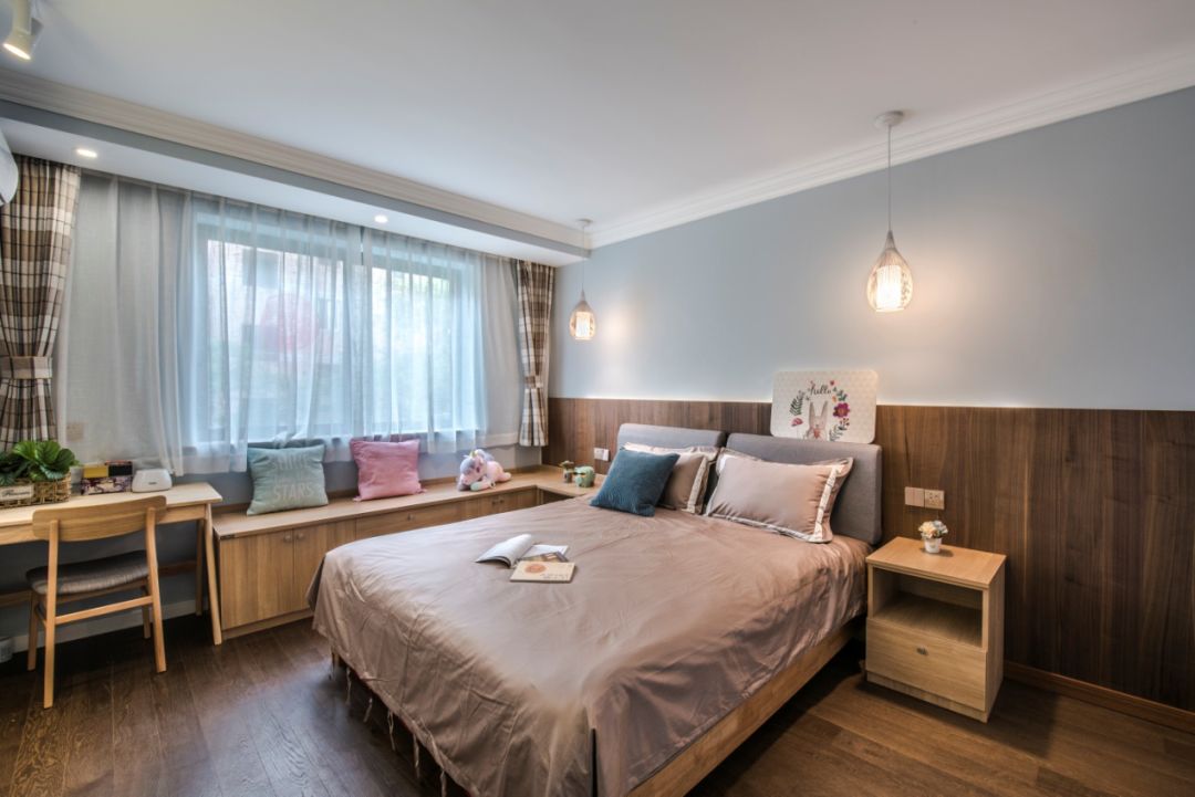 床头背景采用深木色调,房间便多了一丝稳重气息,而深浅色交织对比也丰富了空间层次感。床头的吊灯散发的光晕让整个空间温馨起来了。
