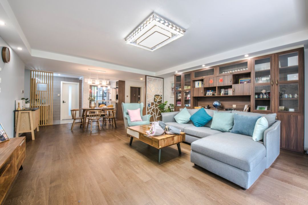 客厅区域整体的硬装设计主要是以白色和雾蓝为主,家具大多采用原木和胡桃木,蓝色布艺沙发让整个空间生机勃勃,木制的家具+布艺的沙发空间的品质就这样体现的恰到好处。