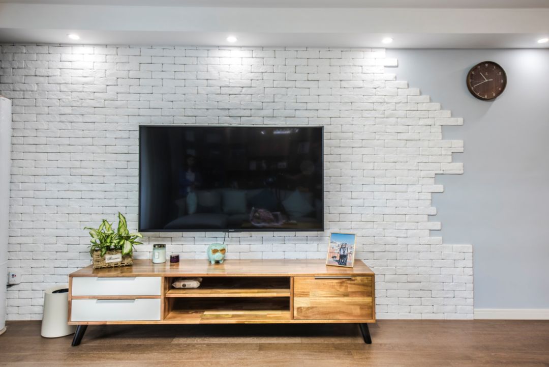 电视背景墙采用雾蓝色的乳胶和白色的文化石,材质的不同运用搭配,表现不一样的质感。墙上用俏皮可爱的圆形闹钟作为点缀。