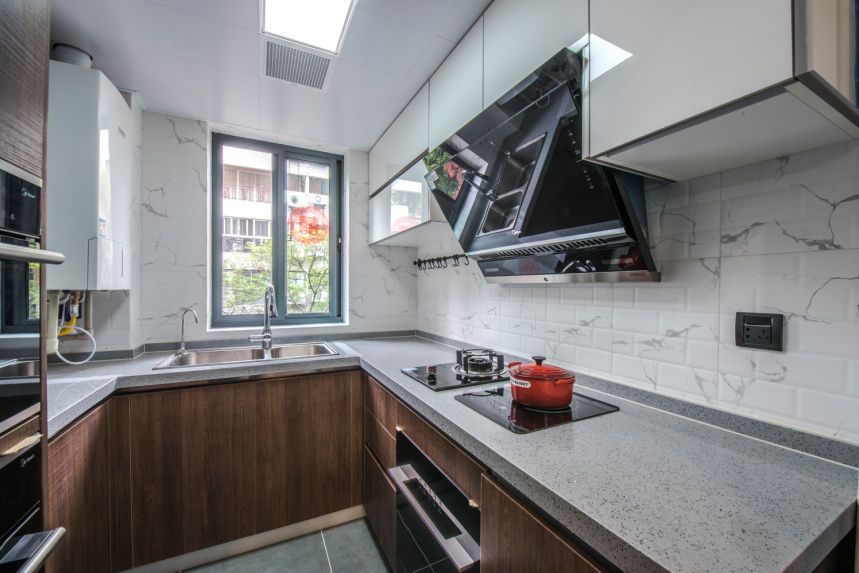 厨房的风格延续餐厅的黑胡桃质感,辅以白色的墙面砖和浅灰色台面,给主人增添料理的清爽心情,同时又不失高贵的格调。