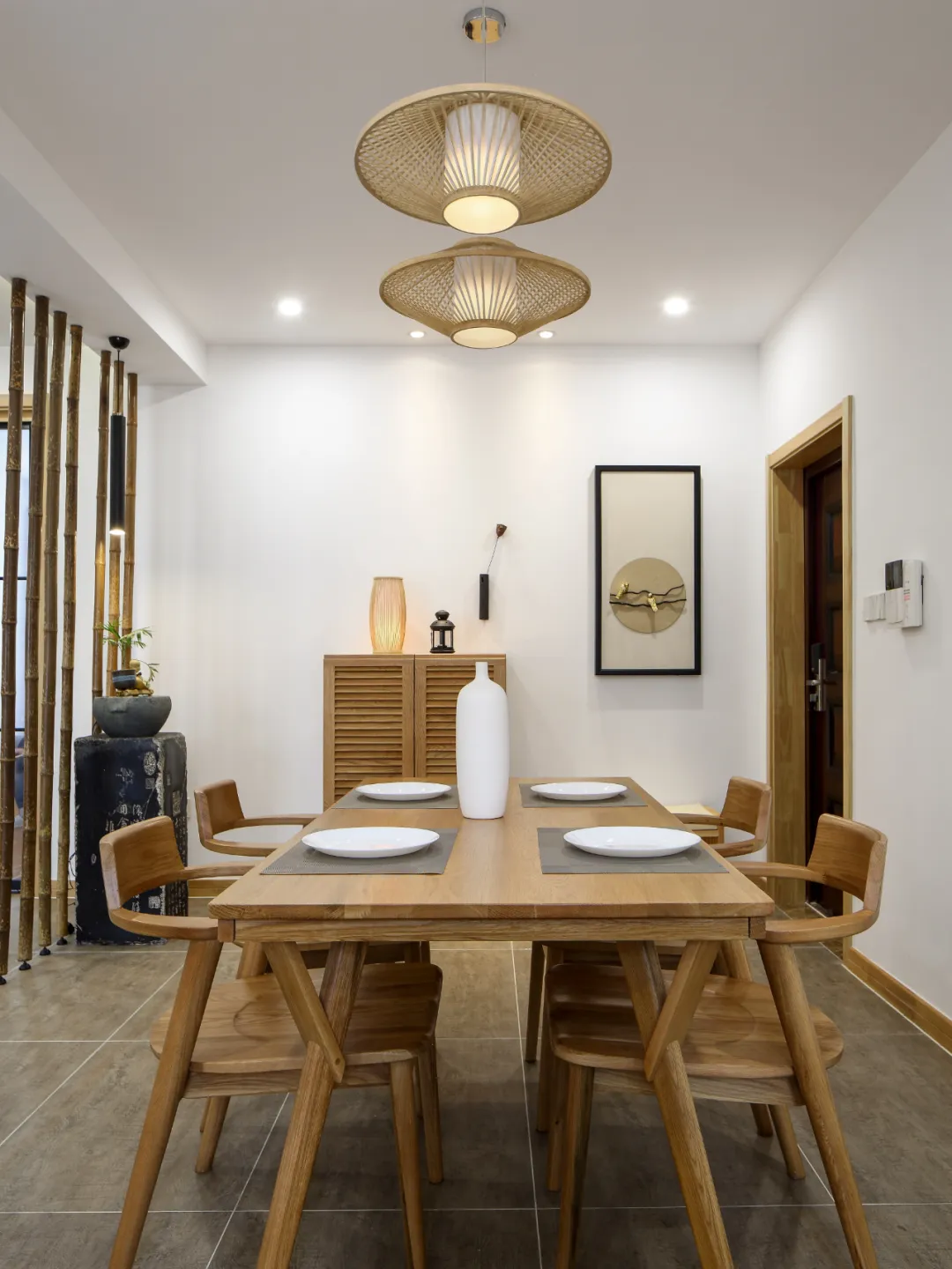 本屋采用日式简约风格,所以在全屋没有做过多的装饰,进门玄关摆放换鞋凳以及一个极具日式风格的鞋柜。并以枯竹的造型打造一个装饰性屏风,点亮空间,使入户看起来不沉闷。