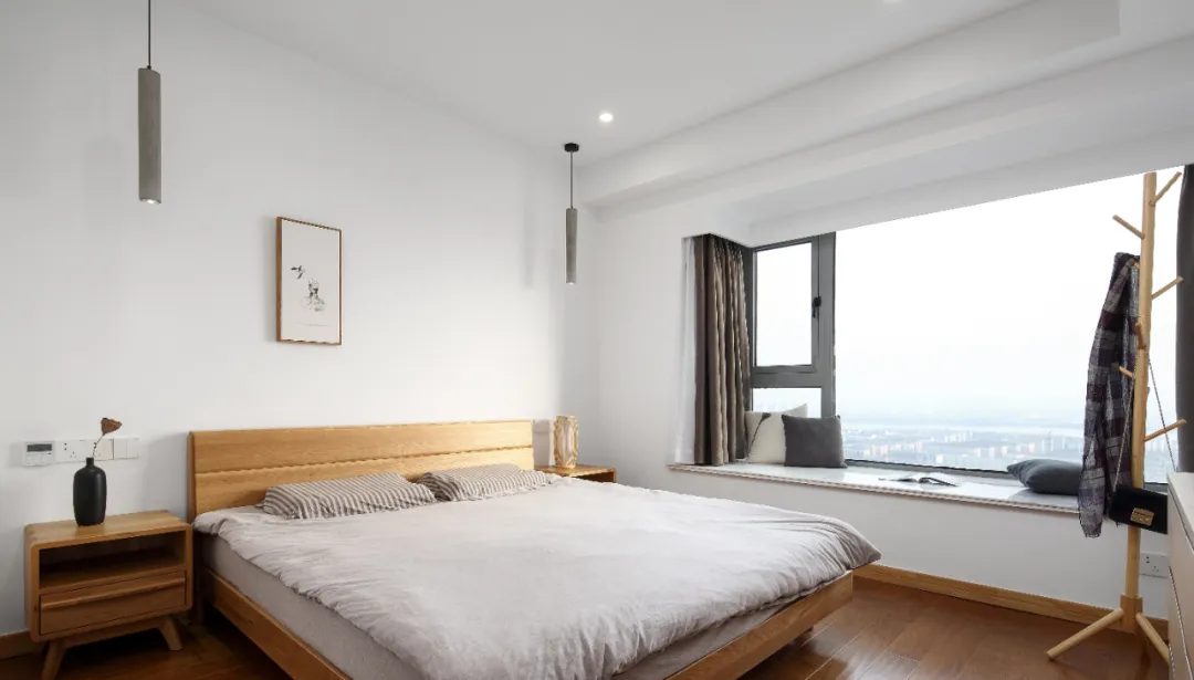 主卧延用了日式风格的室内设计形成了“小、精、巧”的造型模式,从吊灯的造型到床头柜的设计都创造特定的幽柔润泽的光影。在墙面上没有过多的装饰,床头柜的选材搭配上也是满满的日式简约风。使得整个卧室空间更加明亮,增强了卧室的空间感。