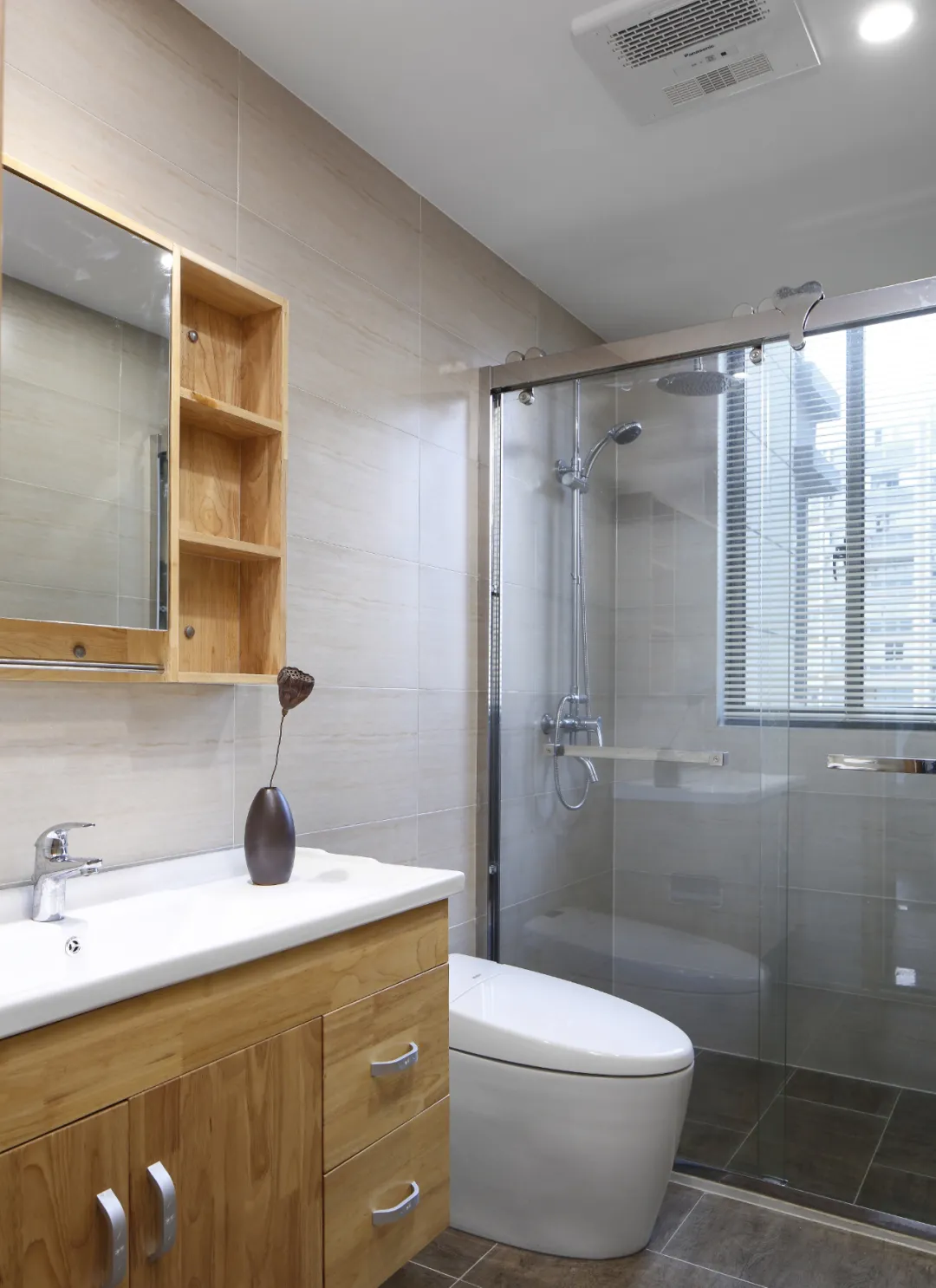虽然是整屋日式风格,但是整体空间并没有日本房屋那么紧凑,所以卫生间采用3分离,空间绰绰有余。极简造型的洗手台搭配原木色柜体,不仅让卫生间看起来更加干净、明亮,更增加了收纳空间,简直是“洁癖患者”的福音。