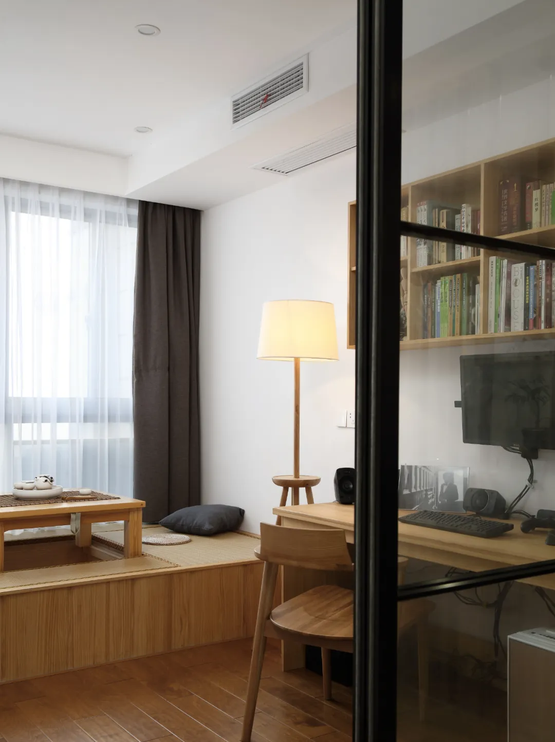 遵循屋主的要求,将书房打造成茶室与办公区域相结合。既然是日式简约风,茶室的榻榻米自然是不可获取的。统一原木色的家具与整屋风格融合。同时将办公区域也规划在内,充分考虑到屋主在工作与休闲的双向需求。在动线设计考虑上,屋主在工作之余,直接在榻榻米休息喝茶,意境十足。