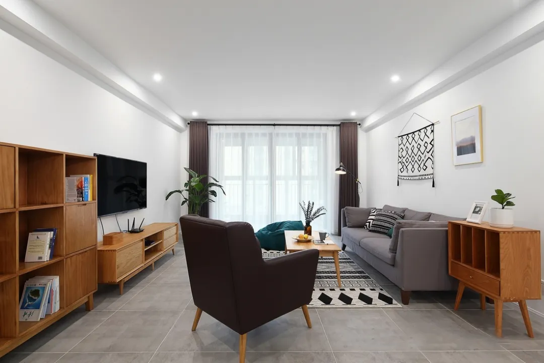 公共空间主要以白色墙面,水泥砖,木色家具为主,客厅灰色布艺沙发,咖色窗帘使空间温文尔雅。挂毯,旅途木框装饰画,小植物,懒人沙发在空间里伴出那星星点点的慵懒时光。