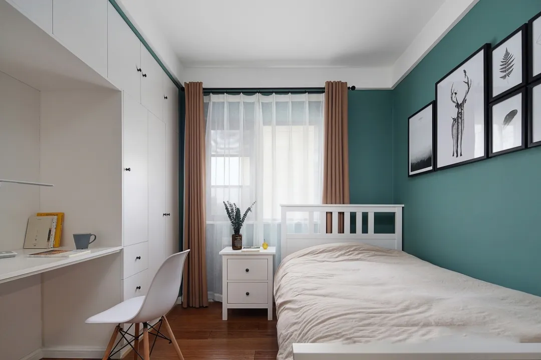 儿童房衣柜结合书桌,即满足了储物的实用性,又节省了卧室的空间,灰度蓝墙面、大地色窗帘、动物森系风装饰画,使空间增加了小孩特有的纯真。