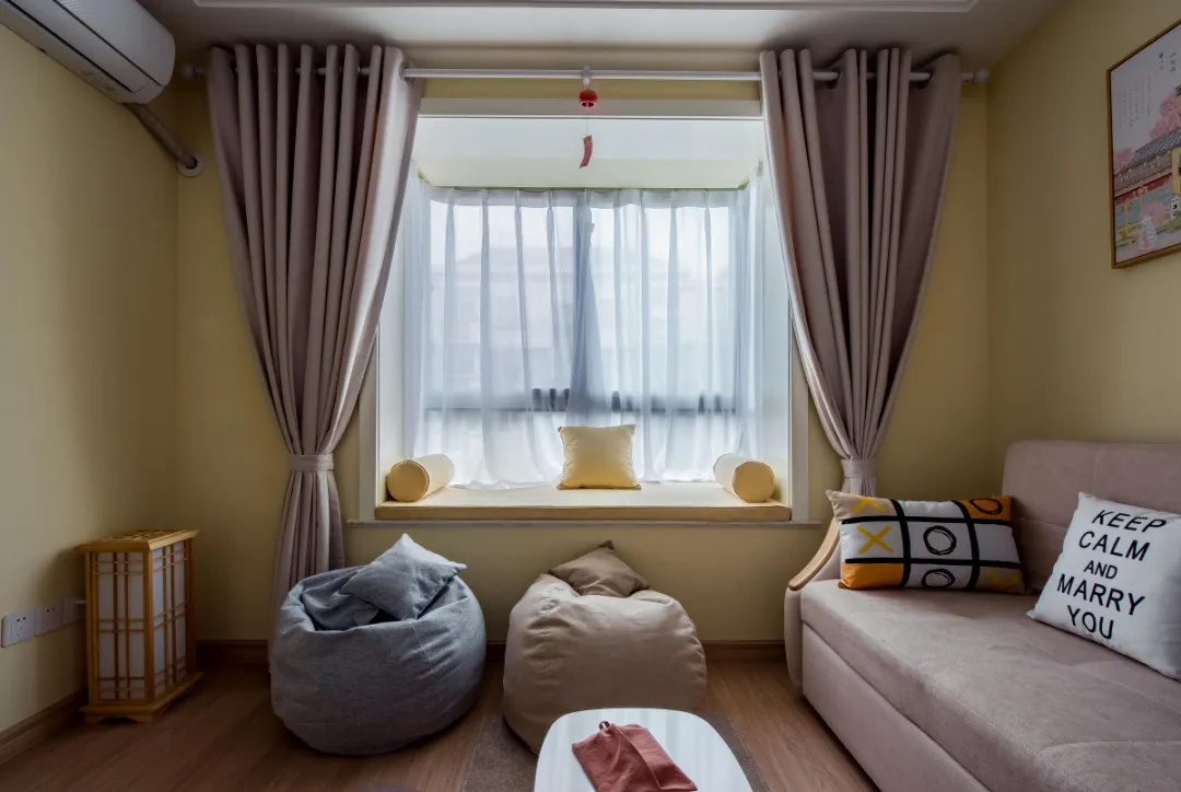 飘窗同样被布置成休闲区域,整个空间在招待好友时显得各位惬意轻松,一切显得格外安宁,加上原木色的地板、清新自然。