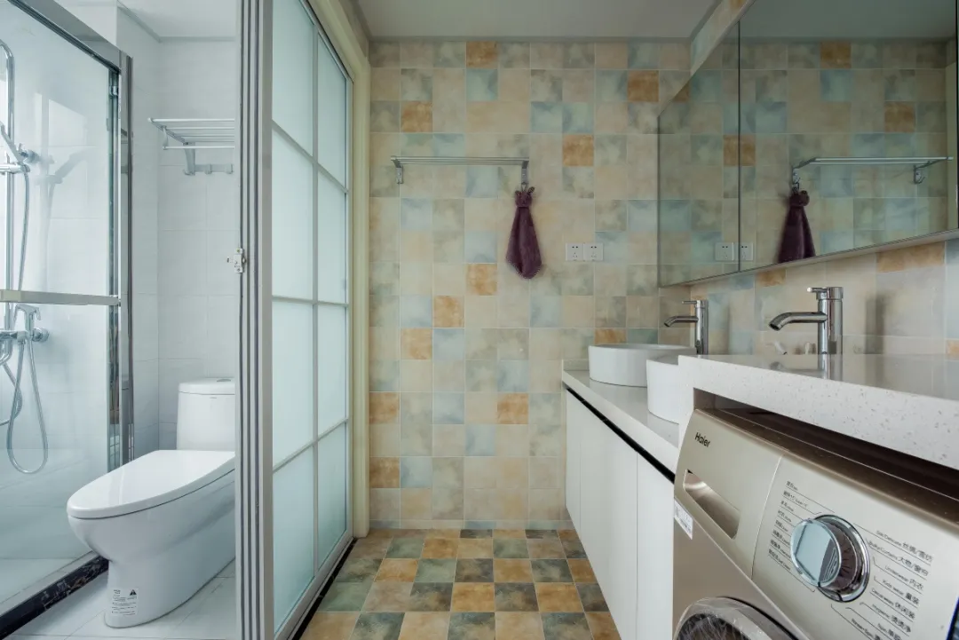卫生间干湿分离、并且干区双台盆,适用于年轻上班族早上洗漱赶时间、非常实用;进入卫生间的干区位置用日式窗帘遮挡避免尴尬,同时色彩的搭配是整个空间充满了活力;