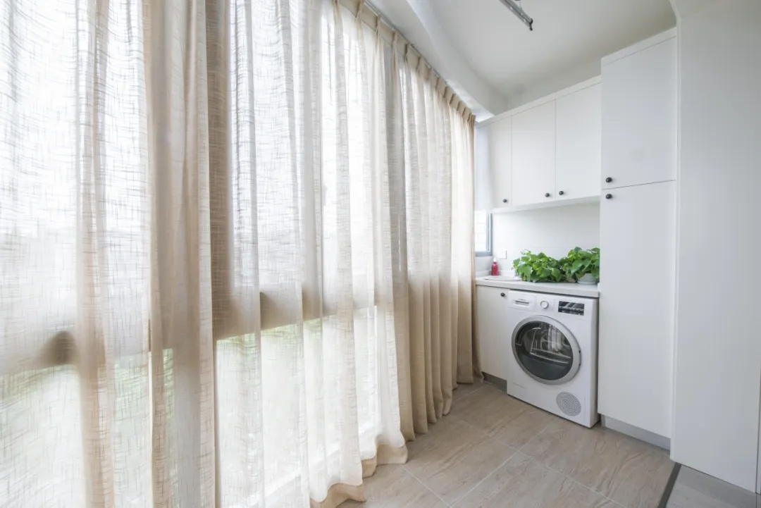 利用台面与墙体之间凹进去的空间,做了一组收纳柜,小小阳台精心的设计。