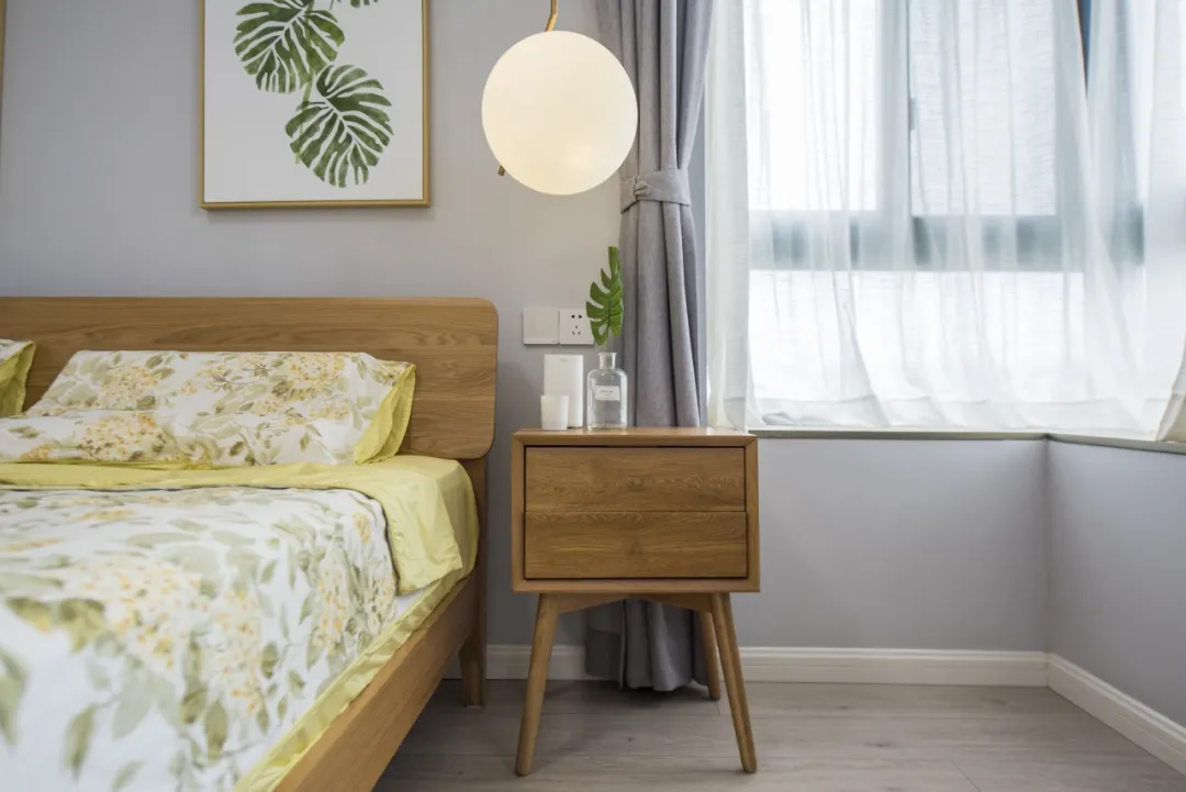 主卧采用大面积的原木色,床、床边柜、梳妆台、落地镜甚至灯和画框都是木色,阳光透过飘窗稀稀落落照了进来,就算在家,也能感受置身自然的美妙。小碎花的床单与自然清新的挂画绿植相结合。